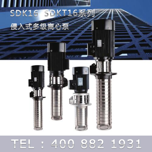 SDK16/SDKT16為配用標準電機的非自吸立式多級離心泵,電機軸和泵軸用聯軸器直接聯接的結構。為滿足水槽或容器的安裝深度,可安裝空套的腔體來改變泵本身的侵入 深度。